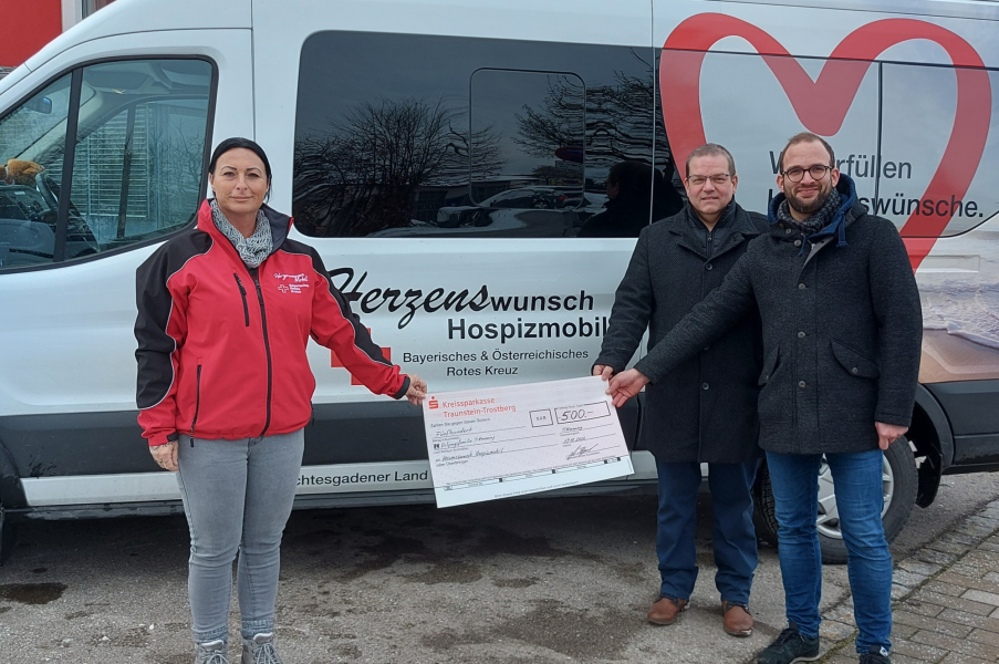 Simone Brunnhuber nahm den Scheck über 500 Euro für den mobilen Pflegedienst entgegen. Der 1. Vorsitzende der Kolpingsfamilie, Norbert Köpferl und Vorstandsmitglied Lukas Ostermayer empfingen die Verantwortliche des Hospizmobils Herzenswunsch kurz vor Weihnachten in Tittmoning.