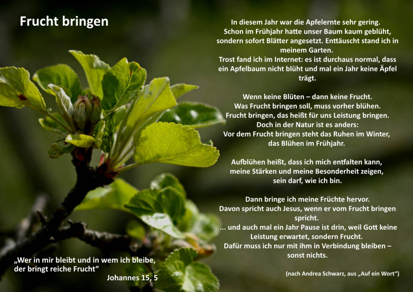 All das und vieles mehr verbinden wir mit der jetzigen Jahreszeit. Jetzt in der Erntezeit haben wir uns für Euch einen kleinen „Moment für Dich“ zum Innehalten überlegt: Frucht bringen, was heißt das überhaupt?