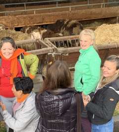 In der Garmischer Fußgängerzone bekamen sie bei "Trachten Grasegger" einen Einblick in die heimische Tracht. Gestärkt mit einem "Cafesito" erlebten sie die Heimkehr der Kühe von der Alm in den Stall nach Partenkirchen. Die Stallarbeit mit Melken und kurzer Info zu Fütterung und Vertrieb rundete den Nachmittag ab.