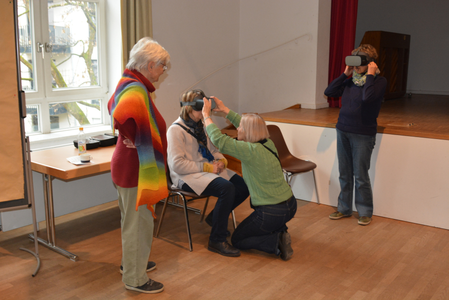 Im Anschluss hatten die Frauen den ganzen Vormittag Zeit, um an den fünf angebotenen Stationen selber die ersten Schritte mit einer VR-Brille zu gehen, ein Bildgenerierungsprogramm auszuprobieren oder einen Einblick in den Nutzen von KI und Robotik in der Medizin zu bekommen. Es gab die Gelegenheit, Unterschiede zwischen verschiedenen Generierungsprogrammen wie zum Beispiel Perplexity oder ChatGPT zu entdecken, oder selbst auszuprobieren, ob man KI-generierte Bilder von echten Fotos unterscheiden kann. An der Smartphone- und Apps-Station konnte jede Frau alle Fragen zum eigenen Handy und den vorhandenen Apps loswerden und sich Tipps und Tricks bei den immer bereit stehenden Referenten abholen.
