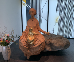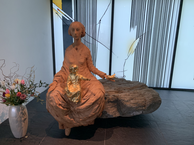 Die Figur sitzt vor einem Buntglasfenster, „auf dem der Heilige Geist wie ein Lichtstrahl auf sie herabkommt und in die Welt hineinwirkt“, heißt es dort als Erklärung dieses Kunstwerkes.