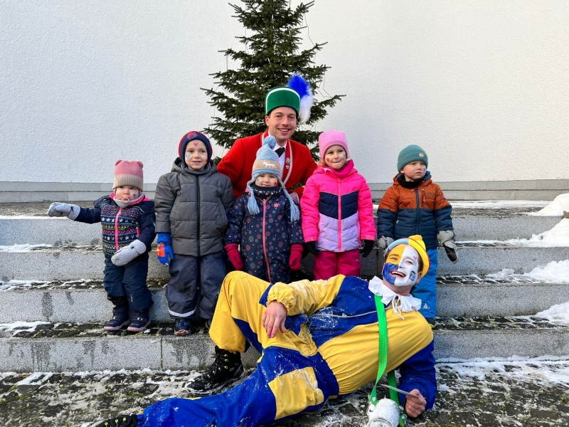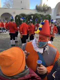 Ein Kasperl im Gefolge verteilt mit schwarzer Farbe Rußnasen, was Glück bringen soll, oder bunte Punkte und Herzen.