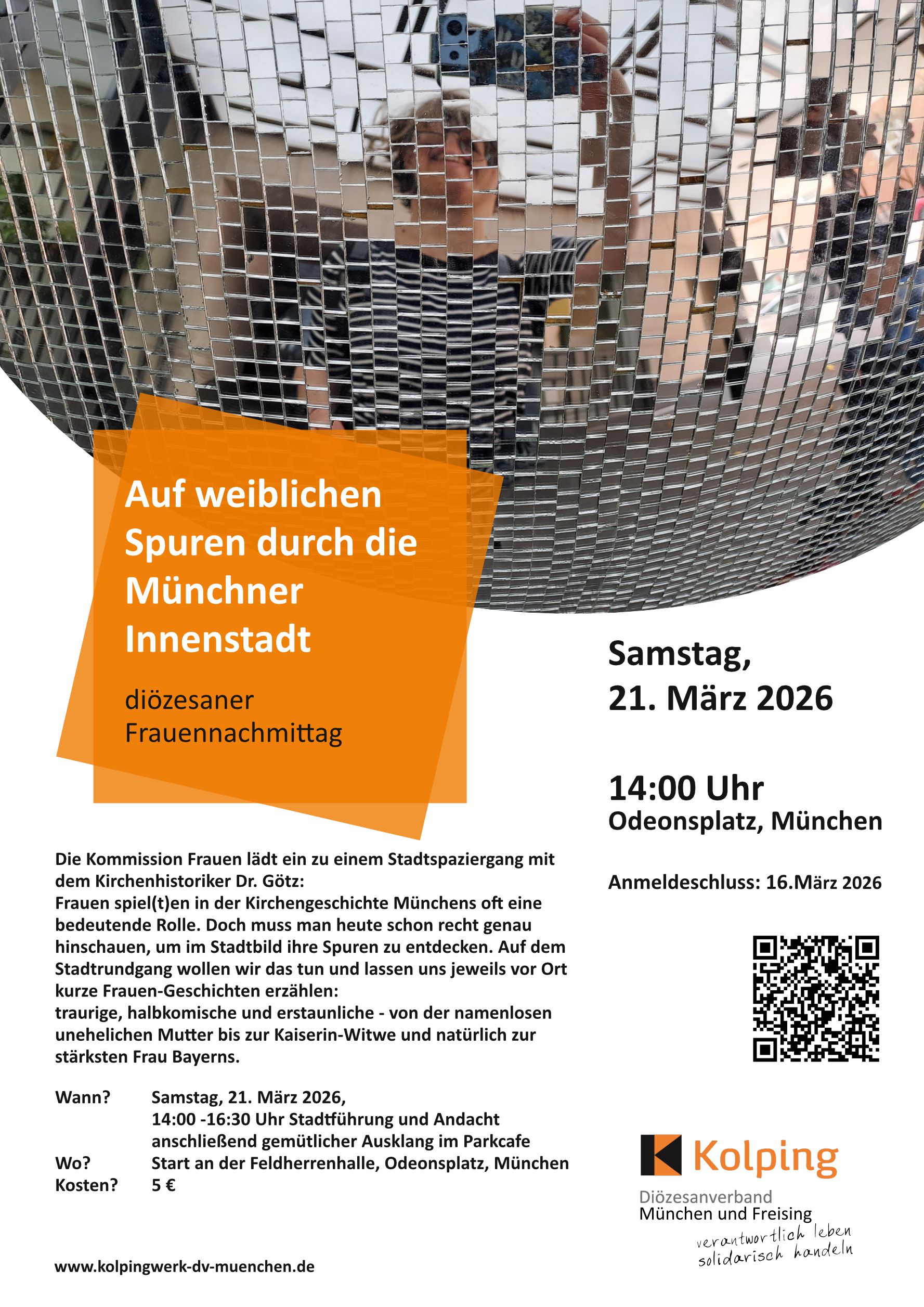 Die Kommission Frauen lädt ein zu einem Stadtspazierganz auf weiblichen Spuren durch die Münchner Innenstadt: Frauen spiel(t)en in der Kirchengeschichte Münchens oft eine bedeutende Rolle. Doch müssen wir heute schon recht genau hinschauen, um im Stadtbild ihre Spuren zu entdecken. Auf dem Stadtrundgang wollen wir uns von unserem Referenten und Kirchenhistoriker Dr. Roland Götz jeweils vor Ort kurze Frauen-Geschichten erzählen lassen: traurige, halbkomische und erstaunliche - von der namenlosen unehelichen Mutter bis zur Kaiserin-Witwe und natürlich zur stärksten Frau Bayerns.