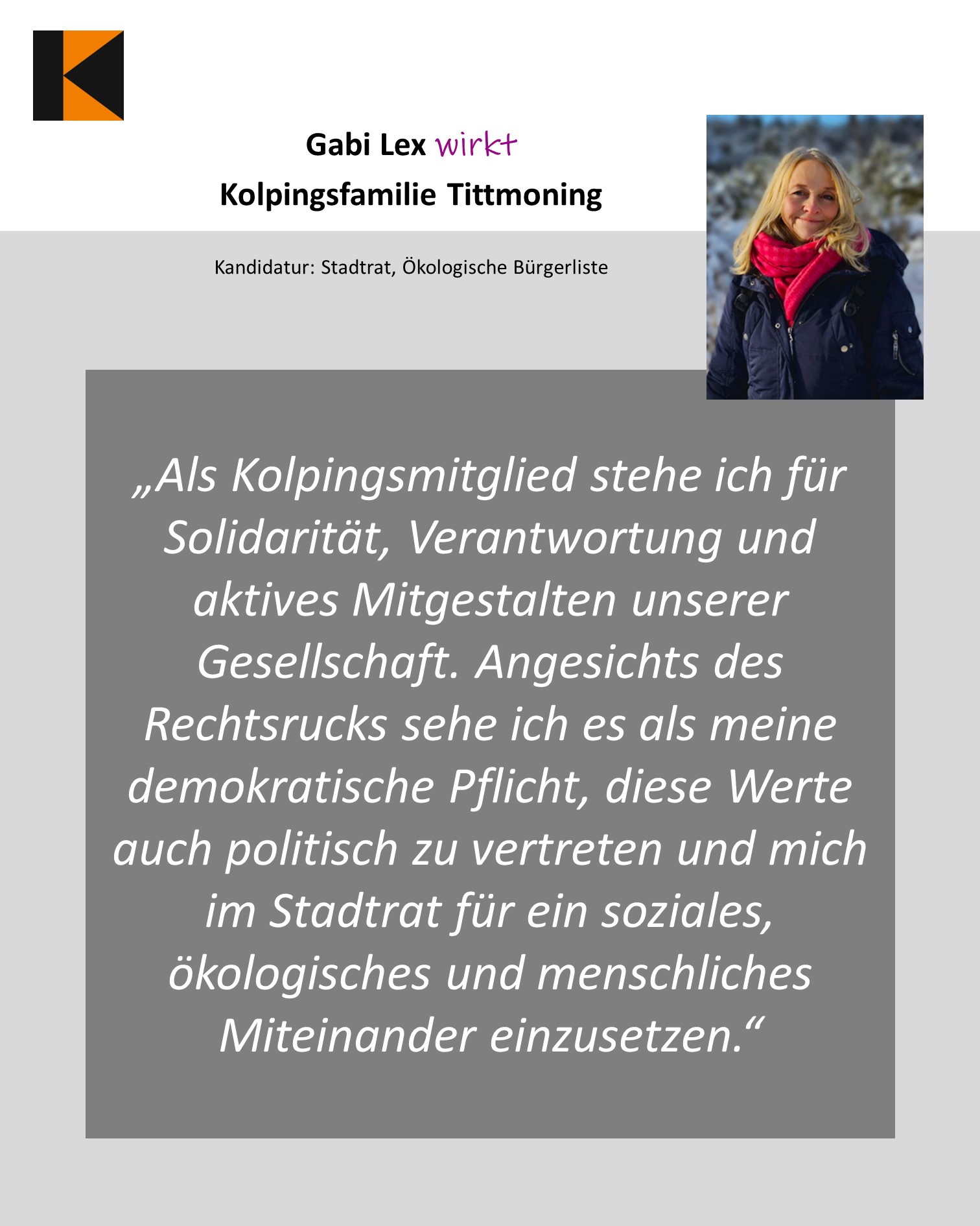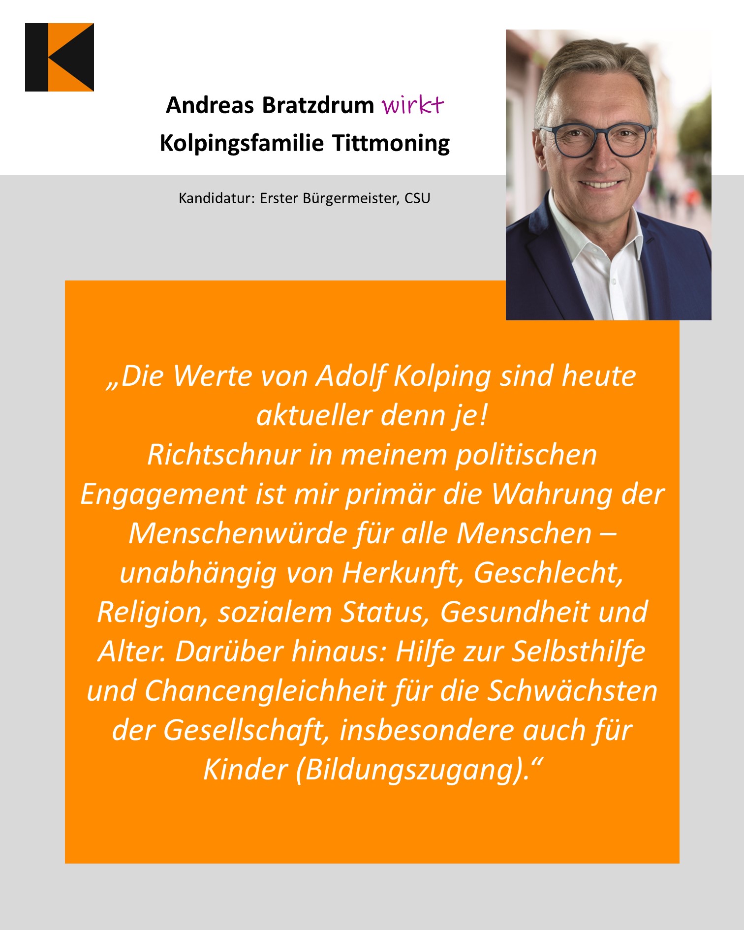Bei den Kommunalwahlen 2026 in Bayern kandidieren viele Kolpingmitglieder für Stadt- und Gemeinderäte oder als Bürgermeister*innen. Mit der Aktion soll sichtbar werden, dass christlich-soziale Werte wie Solidarität und Gemeinschaft unser Handeln prägen – auch in der Politik. Mit persönlichen Porträts wird diesem Einsatz ein Gesicht gegeben und deutlich gemacht: Aus der Kolpinggemeinschaft erwächst Mut zur Mitgestaltung. Gemeinsam tragen wir Verantwortung und gestalten unsere Städte und Gemeinden aktiv mit.